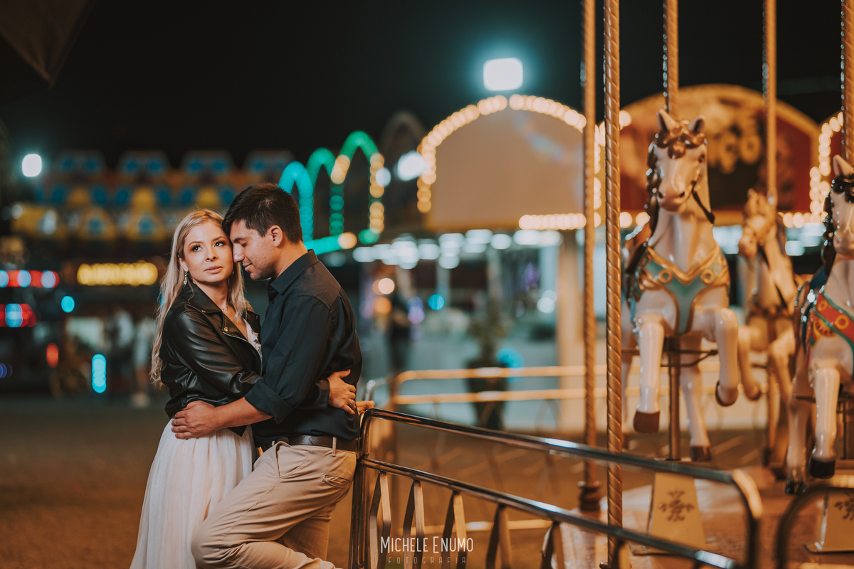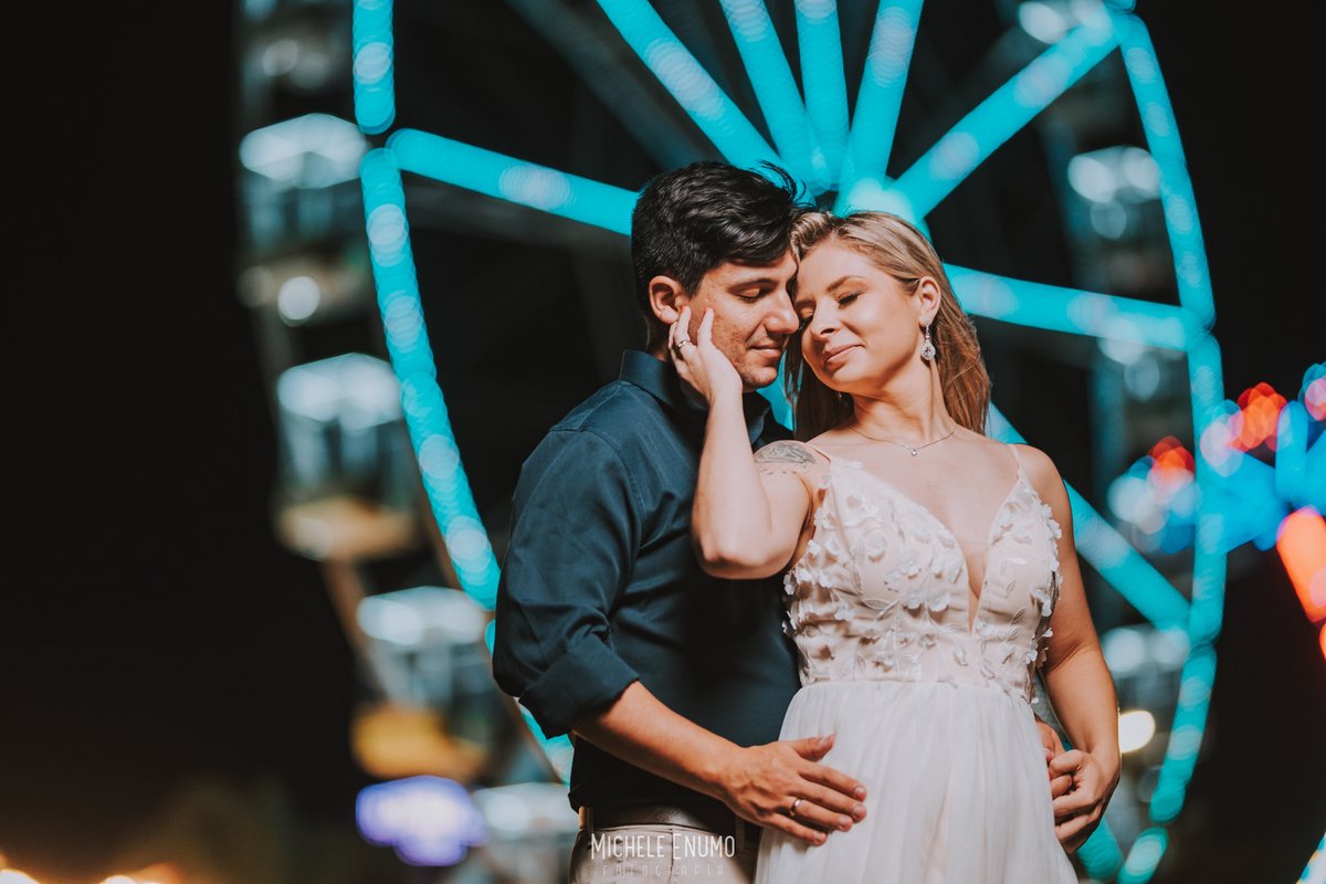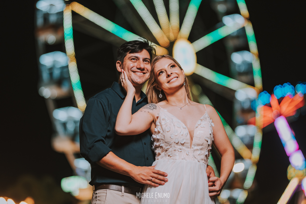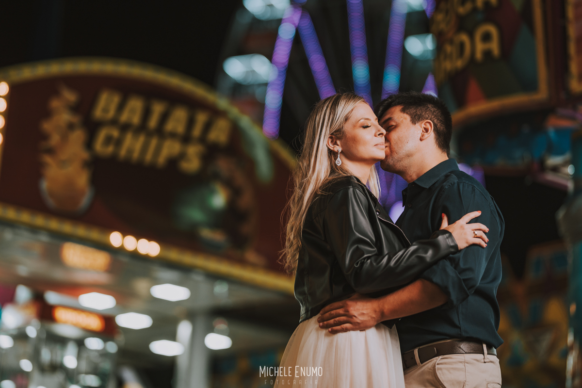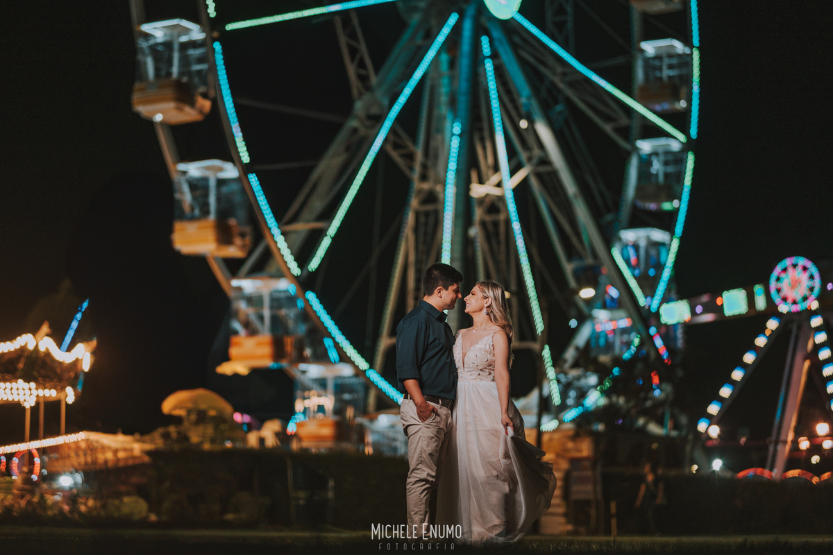 Veja o ensaio pré-casamento de Cassi e Joelsyo, do pôr do sol no Jardim Botânico às fotos noturnas no parque de diversões