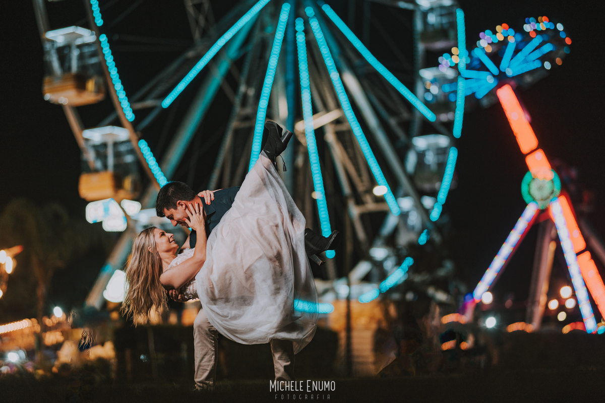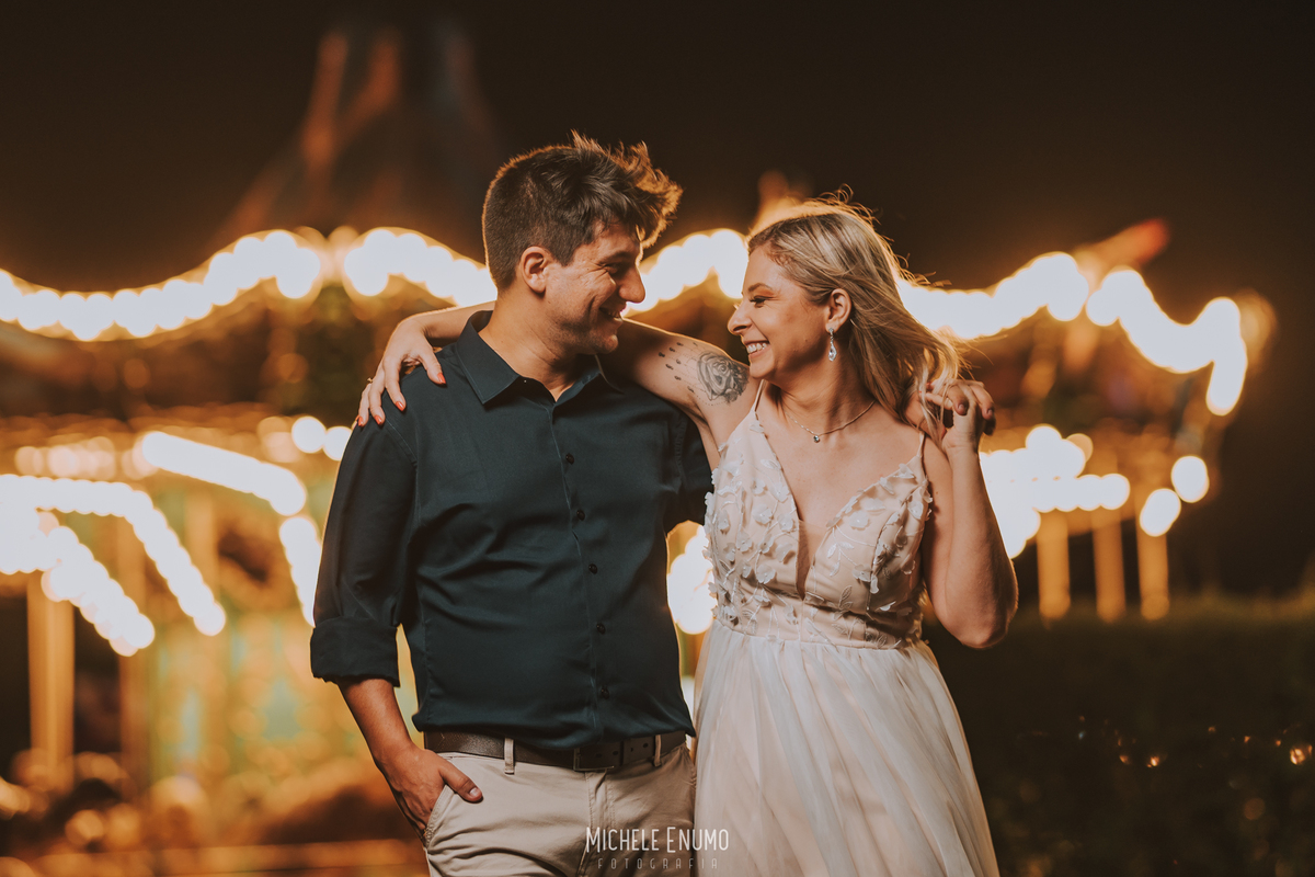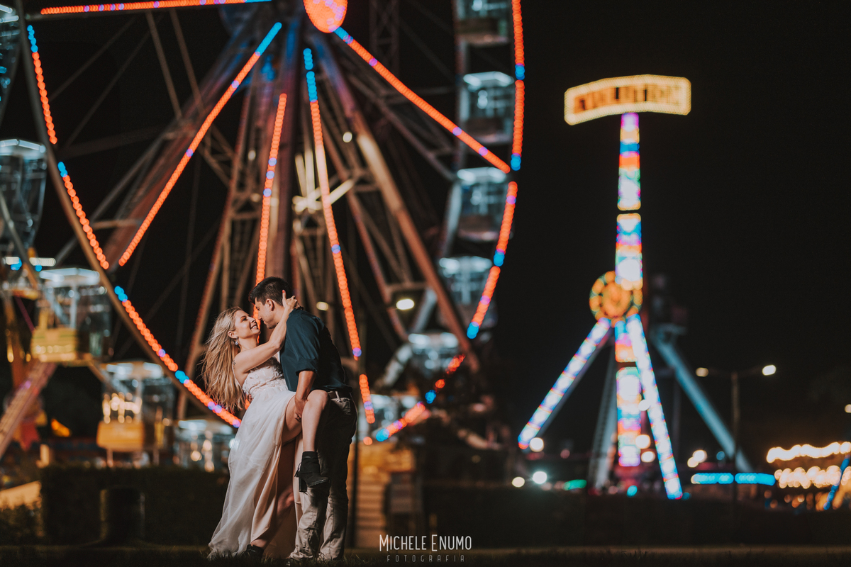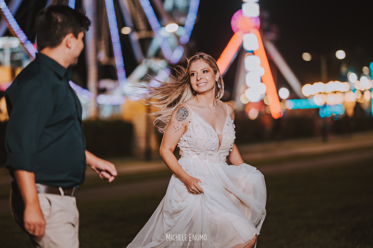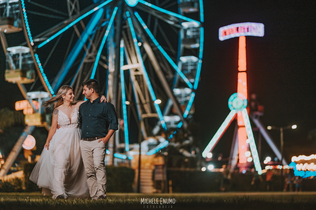Veja o ensaio pré-casamento de Cassi e Joelsyo, do pôr do sol no Jardim Botânico às fotos noturnas no parque de diversões